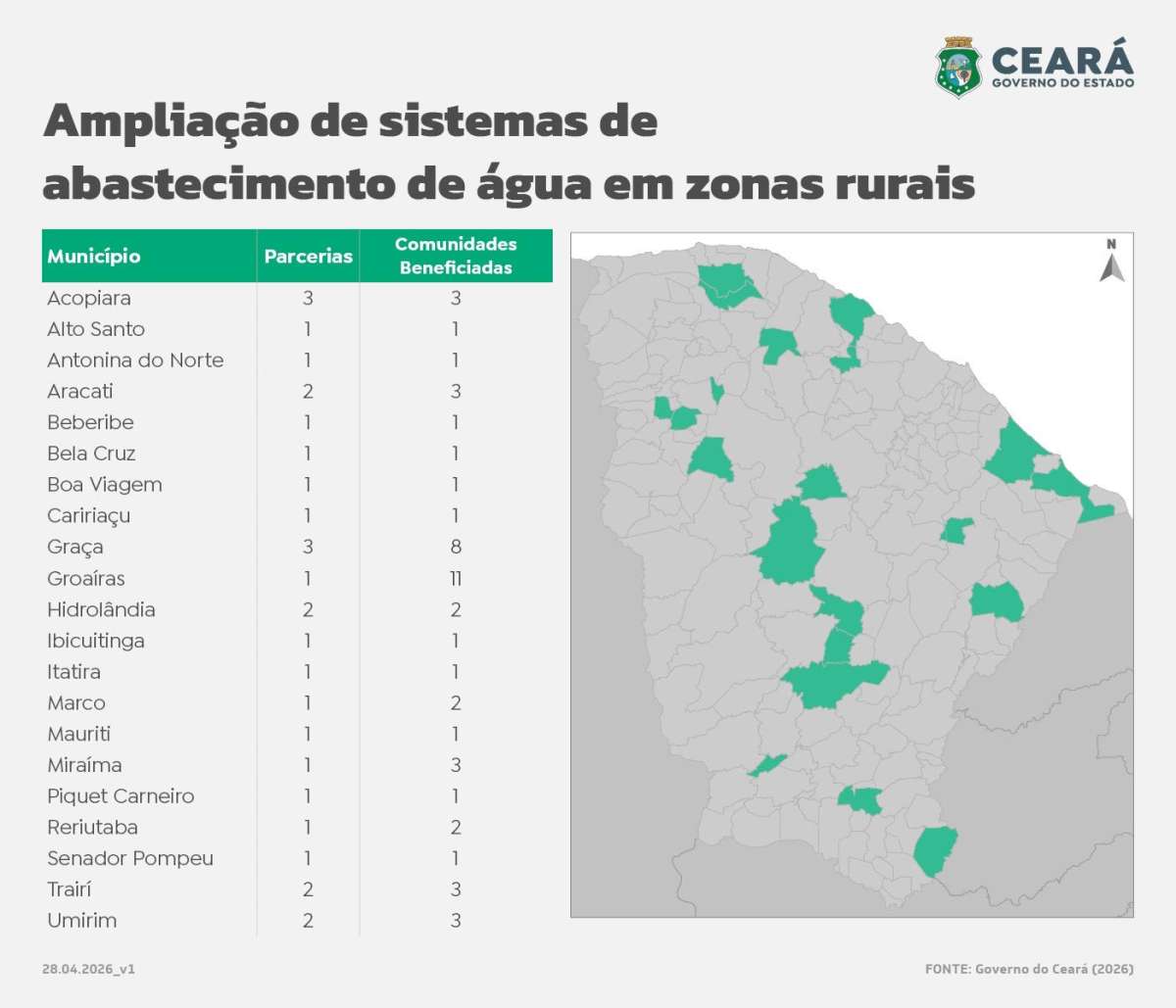 A iniciativa beneficiará mais de 1.700 famílias, alcançando diretamente 6.751 pessoas em 21 municípios cearenses. A ação reforça o compromisso com a universalização do saneamento básico e o acesso à água de qualidade no interior.