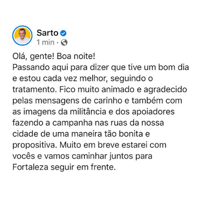 O candidato da aliança liderada pelo PDT, Dr. Sarto, postou agora, à noite, nas redes sociais, mensagem dirigida aos militantes e à população de Fortaleza. "Tive um bom dia, estou cada vez melhor", escreveu Sarto. Ele encerrou sua mensagem, informando que, "em breve, estará de volta".